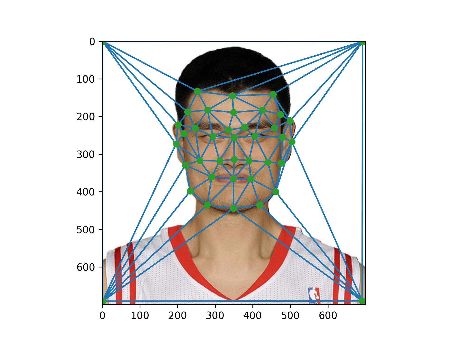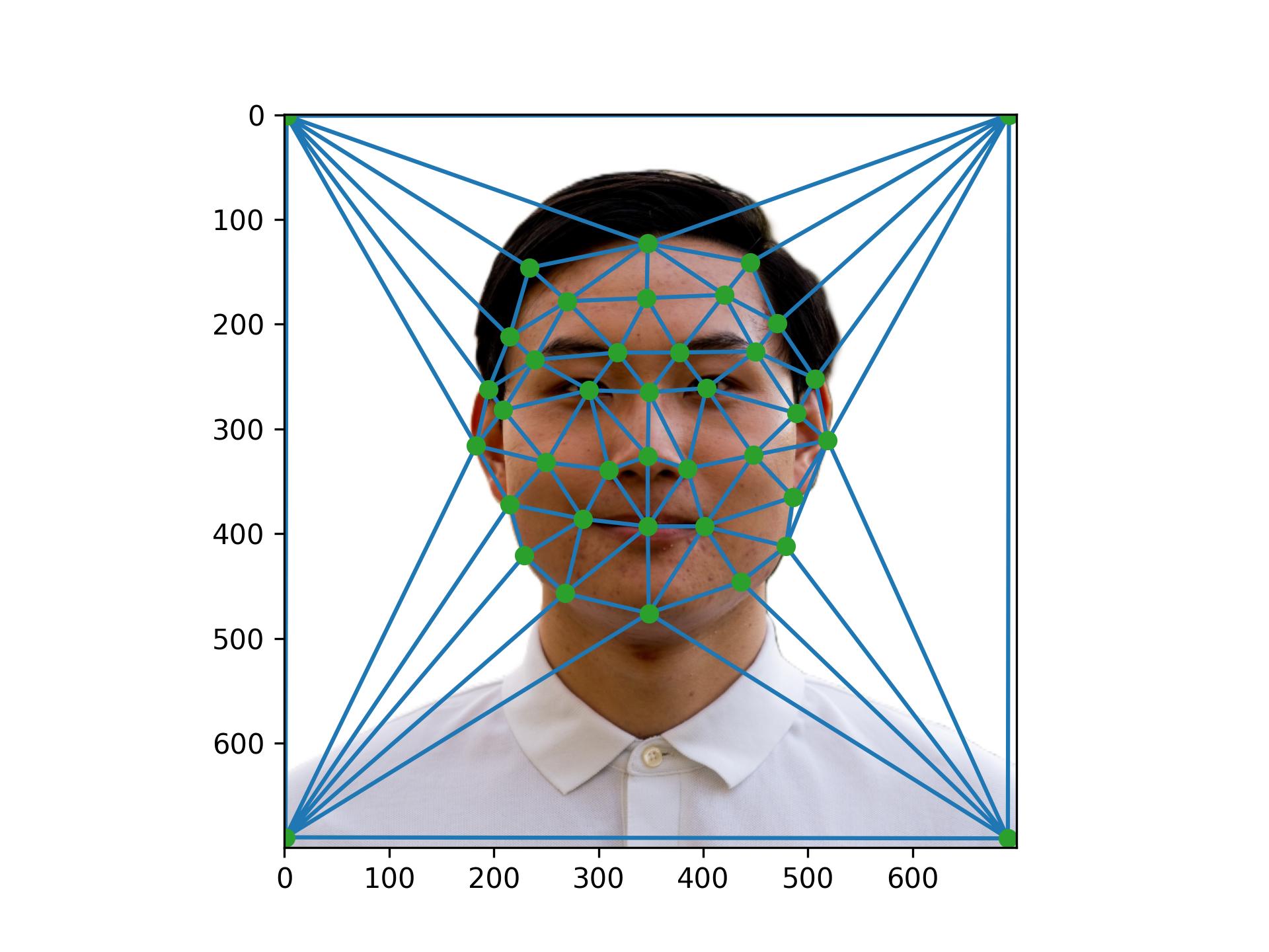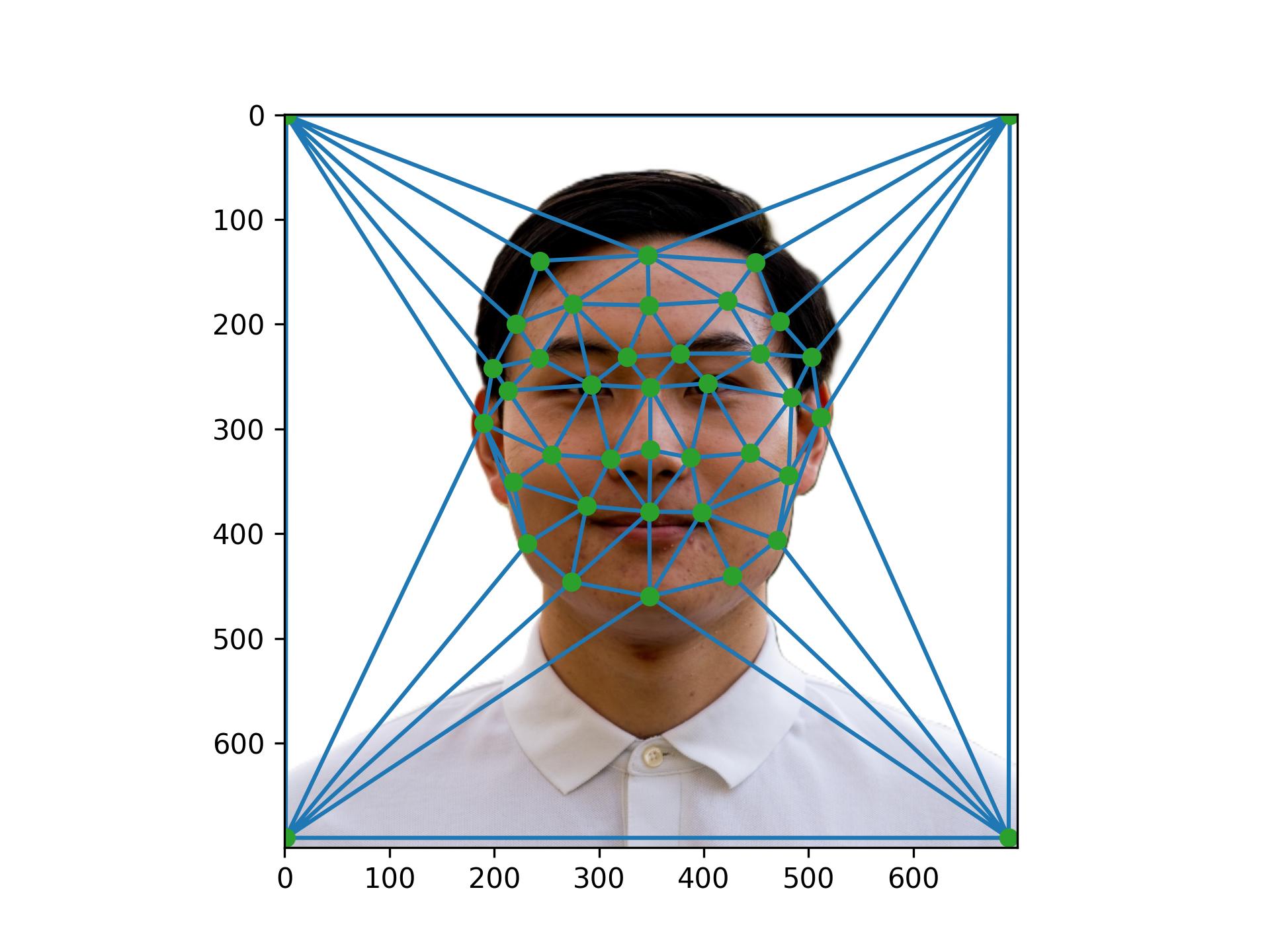Before computing the morph sequence, I need to compute the mid-way face between both photos. This involves computing the average shape of both faces, warping both faces into the shape, and averaging the colors together. To compute the average shape, I averaged each of the keypoint locations in the two photos, and then created a triangulation on top of the averaged points. Below is an image of the average face.