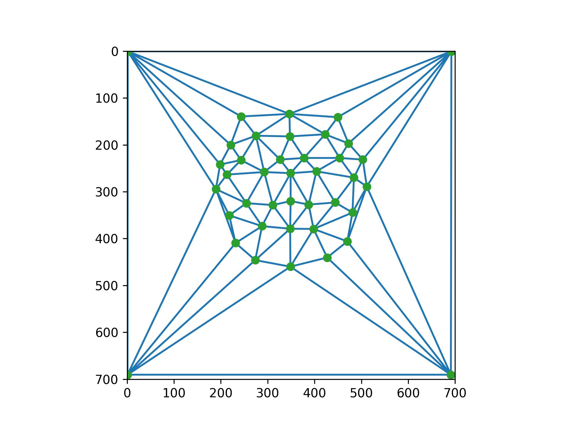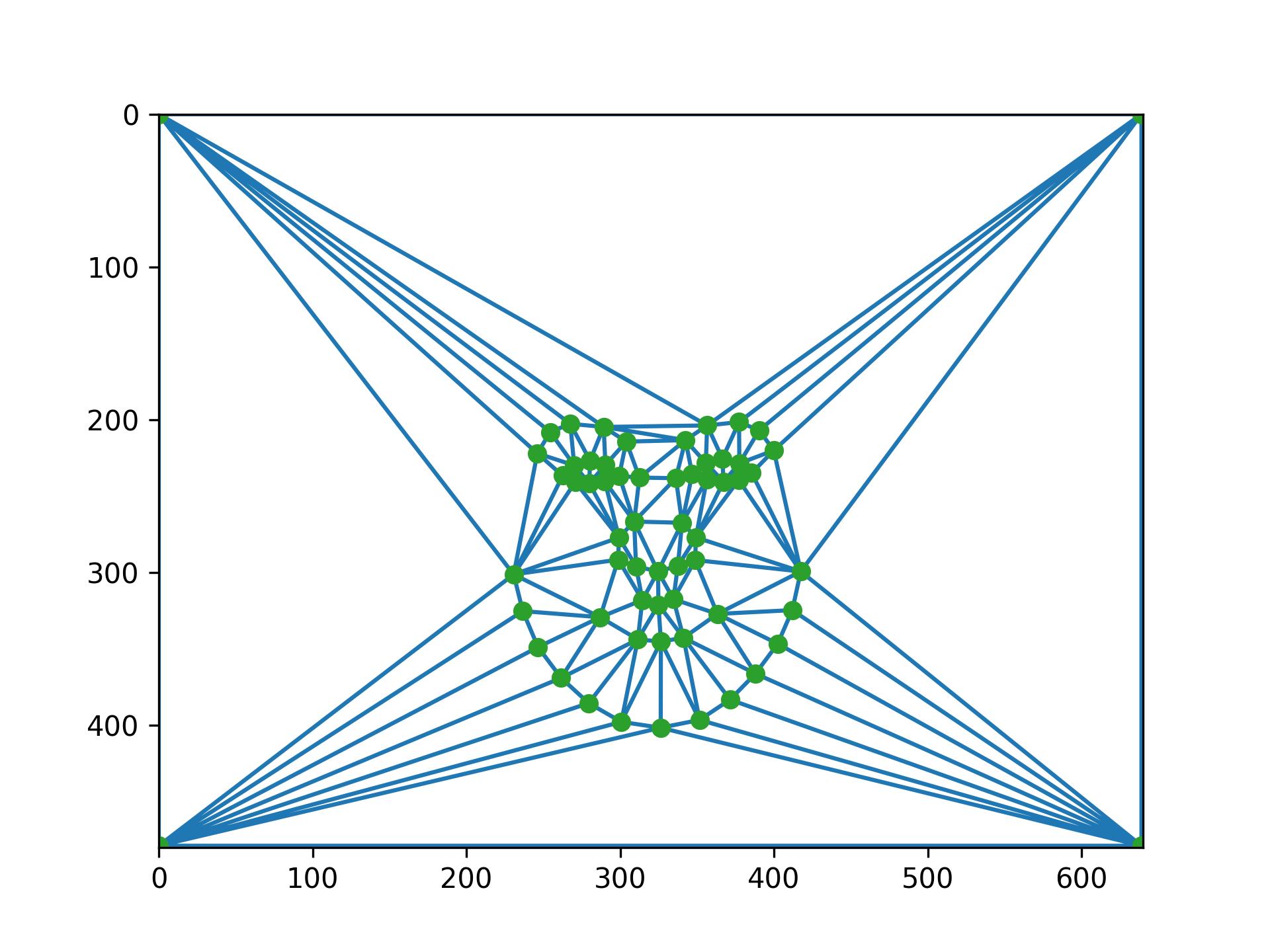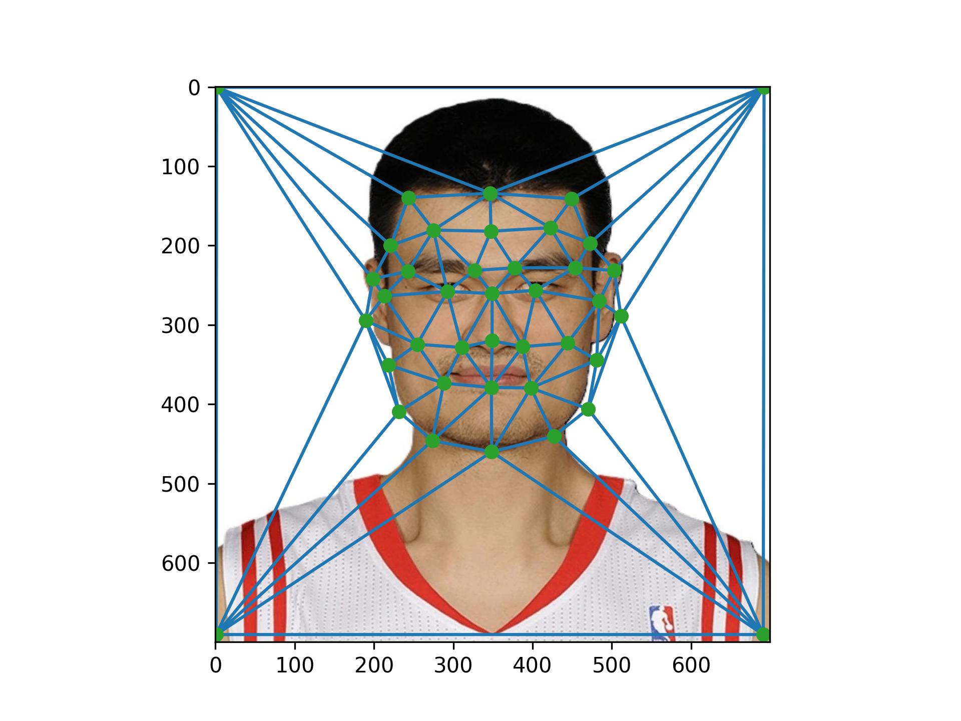 Before computing the morph sequence, I need to compute the mid-way face between both photos. This involves computing the average shape of both faces, warping both faces into the shape, and averaging the colors together. To compute the average shape, I averaged each of the keypoint locations in the two photos, and then created a triangulation on top of the averaged points. Below is an image of the average face.