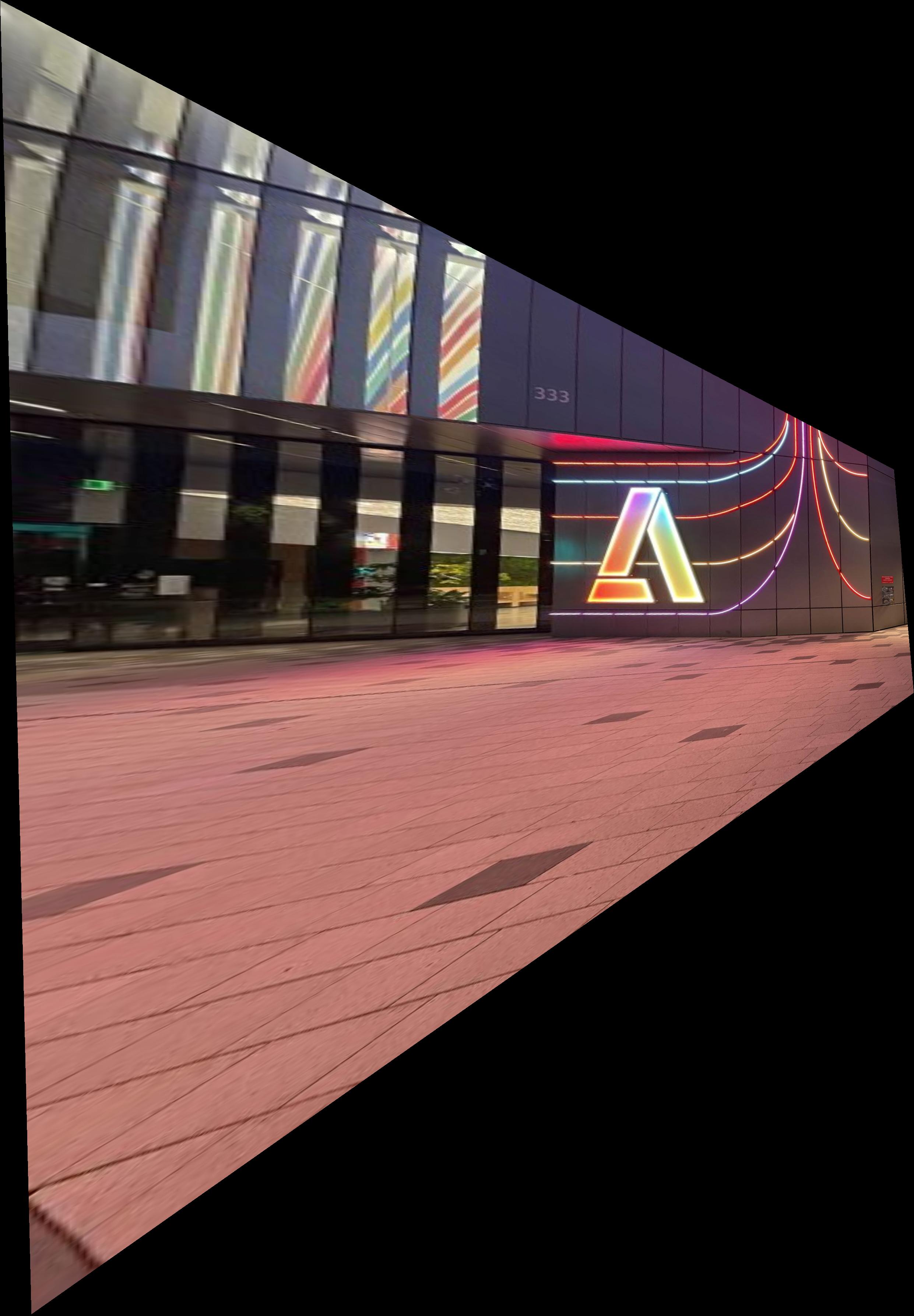 With a given homography matrix $H$, we can now warp our images from one image to another. Firstly, we need to find the size of the resulting warped image by first applying our homography matrix $H$ to the four corners of our input image. The resulting width and height is the differences in the maximum and minimum $x$ and $y$ coordinates of all four corners. Next, using the same corners, we draw out a mask containing points of where our image would be warped to, using the skimage.ndimage.polygon function. We may need to shift our corners such that all corners have a nonnegative $x$ and $y$ value. Lastly, with the mask, we can use an inverse warping technique by multiplying the points in our mask by $H^{-1}$, the inverse of our homography matrix, to interpolate the pixel value at each location. Our method will use bilinear interpolation through the scipy.interpolate.griddata function.