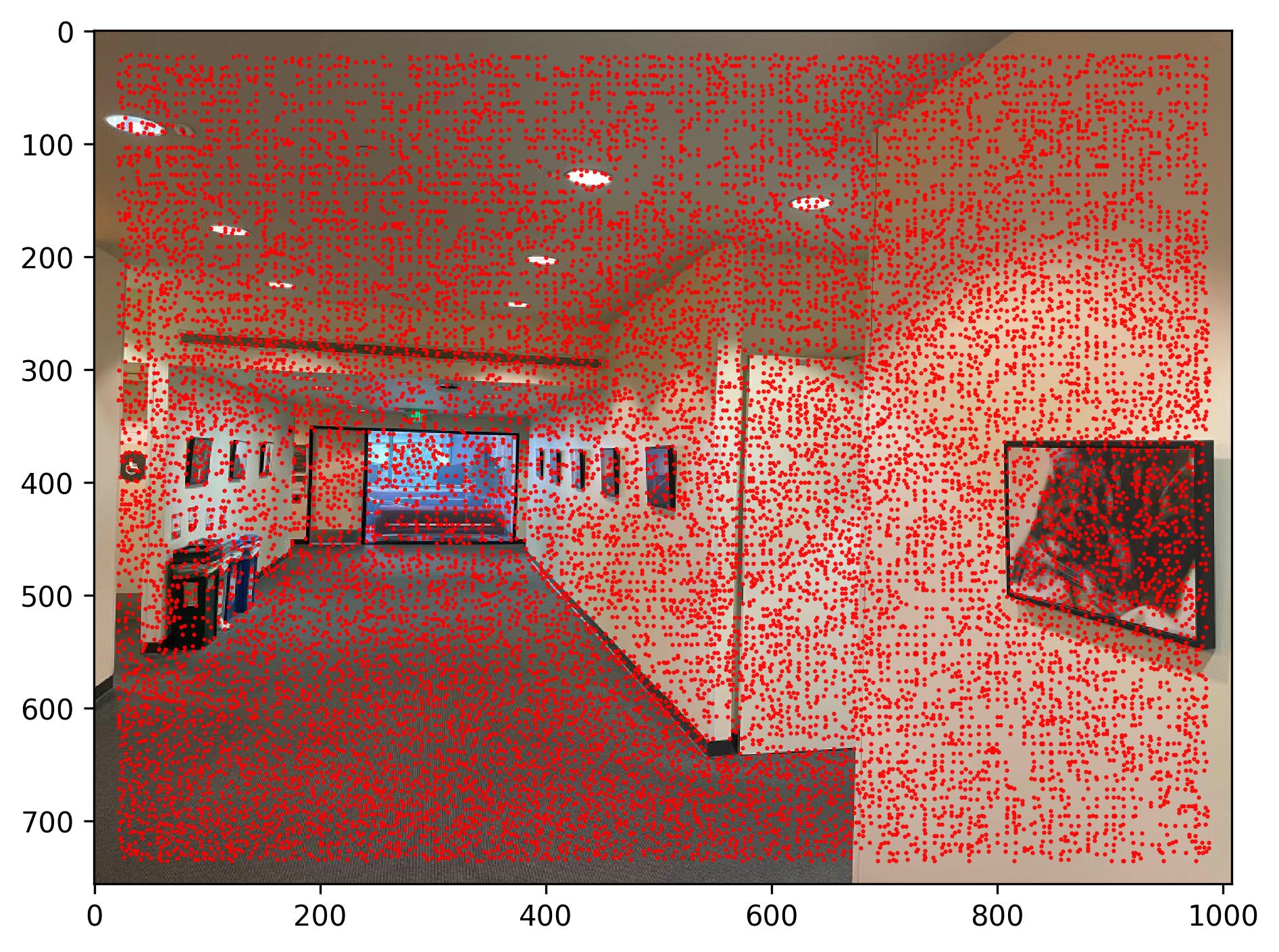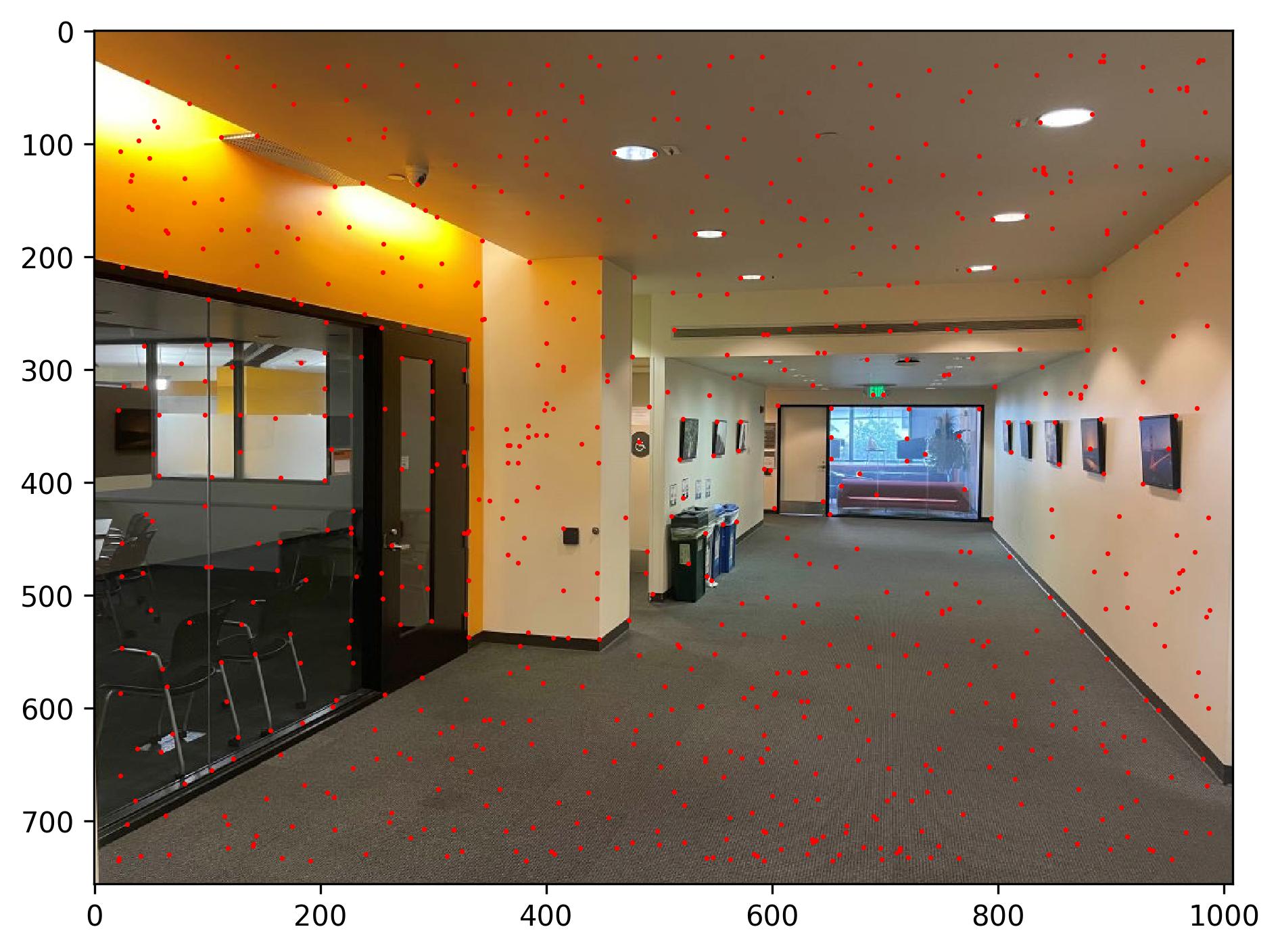 To match the points, we run a nearest neighbor algorithm on the descriptor vectors, keeping only the nearest and second nearest neighboring descriptor vector. If the ratio of the distances between the nearest neighbor and the second nearest neighbor is below a certain threshold $t$, then we have found a match. For this project, the threshold $t$ is set to $0.4$. The idea behind this is that if we have two descriptor vectors that are close in terms of distance, we are unsure of which of the two points to match to. Since we are unsure, the easiest way to deal with this is to just throw the point out (i.e. no match). Below are the points left over after matching the points from each image.