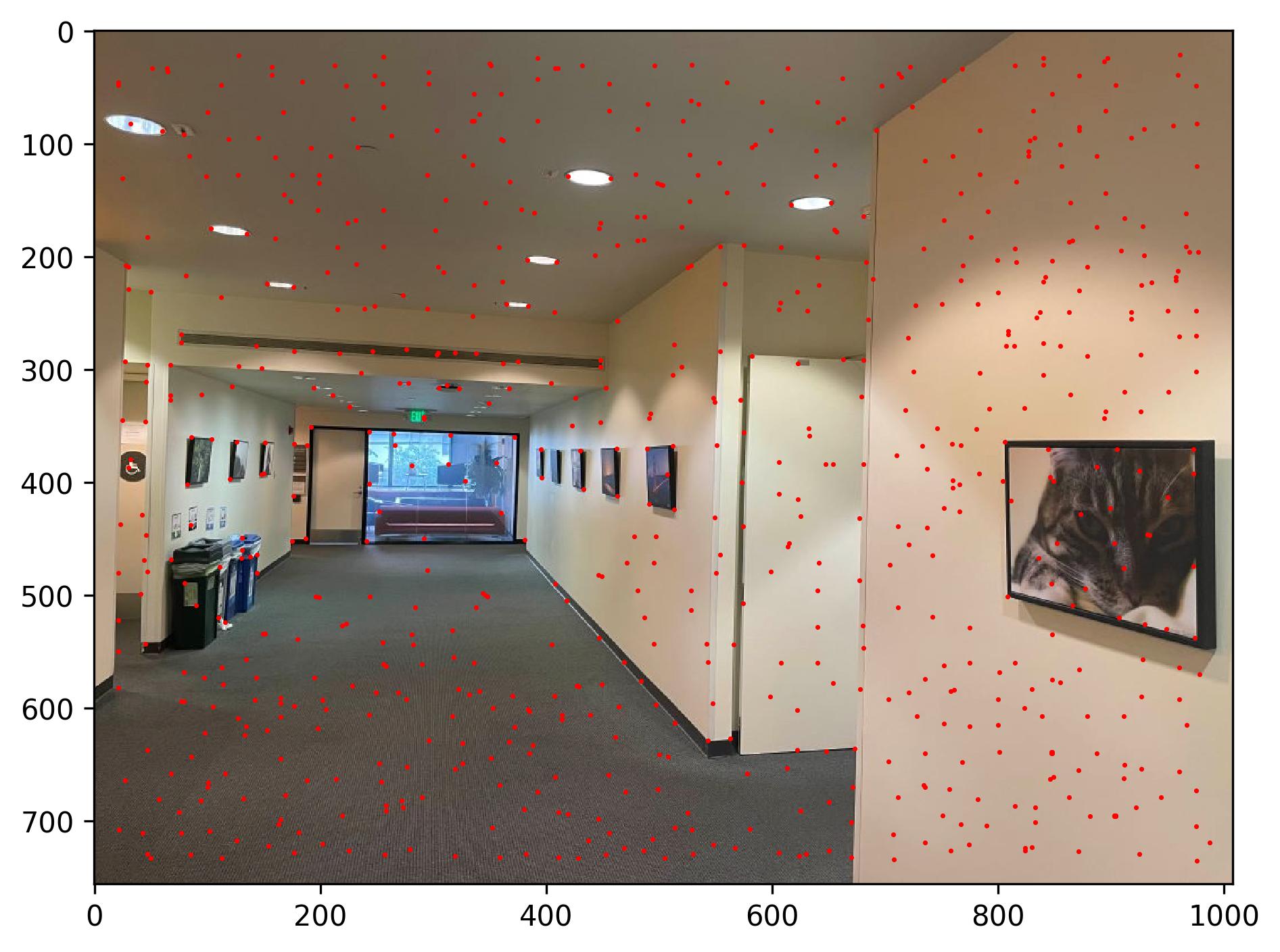 The first step requires computing possible correspondence points. Generally, good correspondence points exist in corners. In order to compute corners, we used the Harris Corner Detector to compute a large set of points. The Harris Corner Detector also assigns a strength value to each corner, indicating the corner response. A large strength value correlates to a higher likelihood of the point being a corner instead of an edge or a flat region. The results from applying the Harris Corner Detector can be seen below on the photos from Soda Hall.